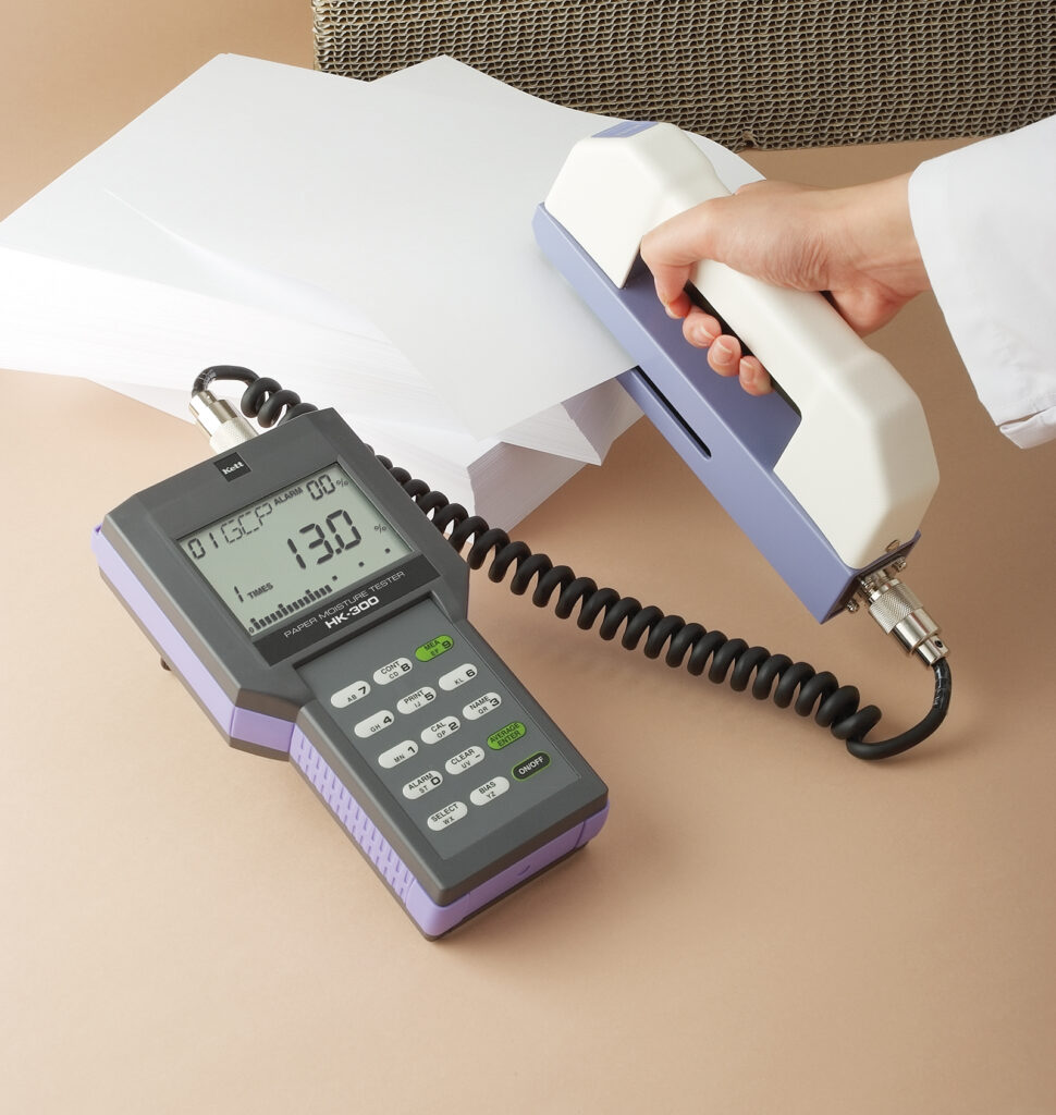 The HK-300 uses electrical resistance to measure moisture in paper products. When a sensor contacts the paper surface, the instrument sends a small, safe electrical current through the fibers. Dry paper resists electrical flow; moisture reduces that resistance. The processor converts the measured resistance into a moisture percentage and displays the result on the LCD, typically within three seconds of contact.
