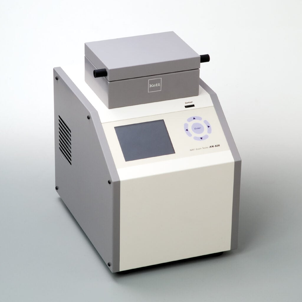 Kett grain and rice quality instruments use near-infrared (NIR) transmittance technology to measure the composition of whole grain samples. A tungsten lamp sends NIR light through the sample, and a precision spectroscope detects the transmitted wavelengths between 600 and 1100nm. The instrument compares the absorption pattern against factory or customer-created calibration curves to calculate moisture, protein, amylose, and fat content in approximately 40 seconds.